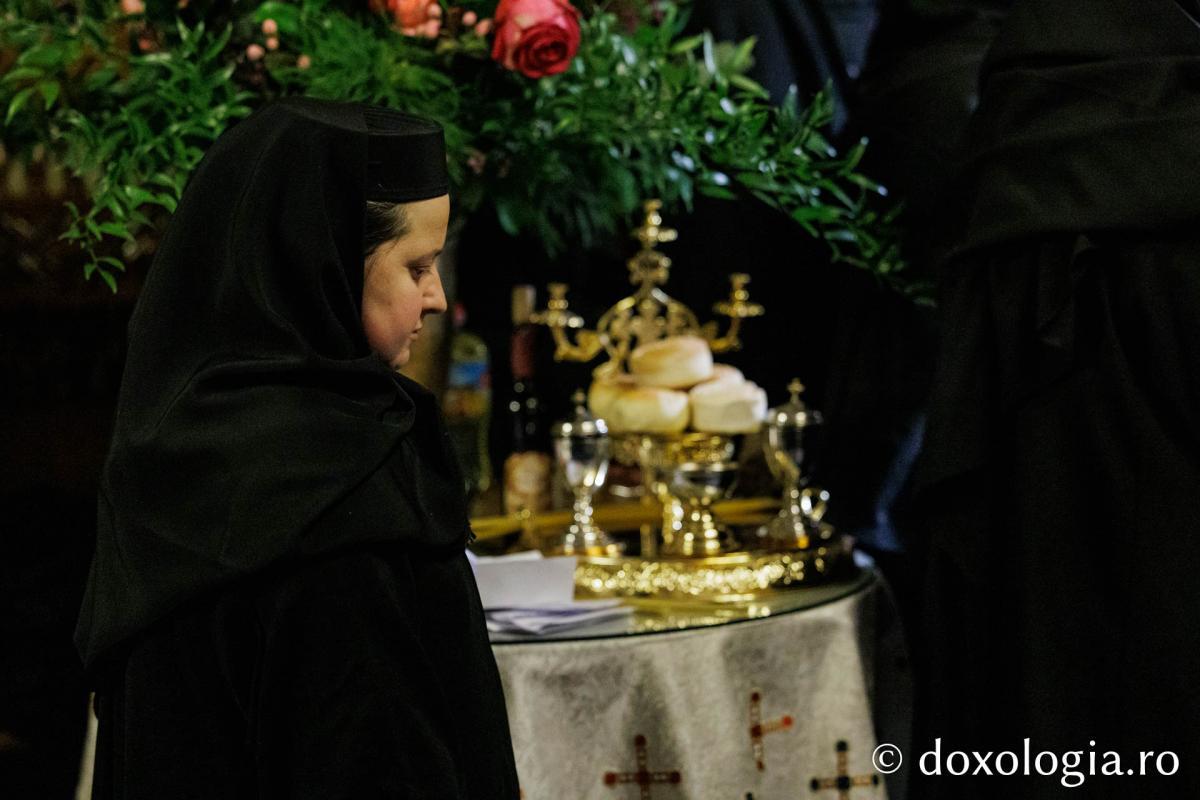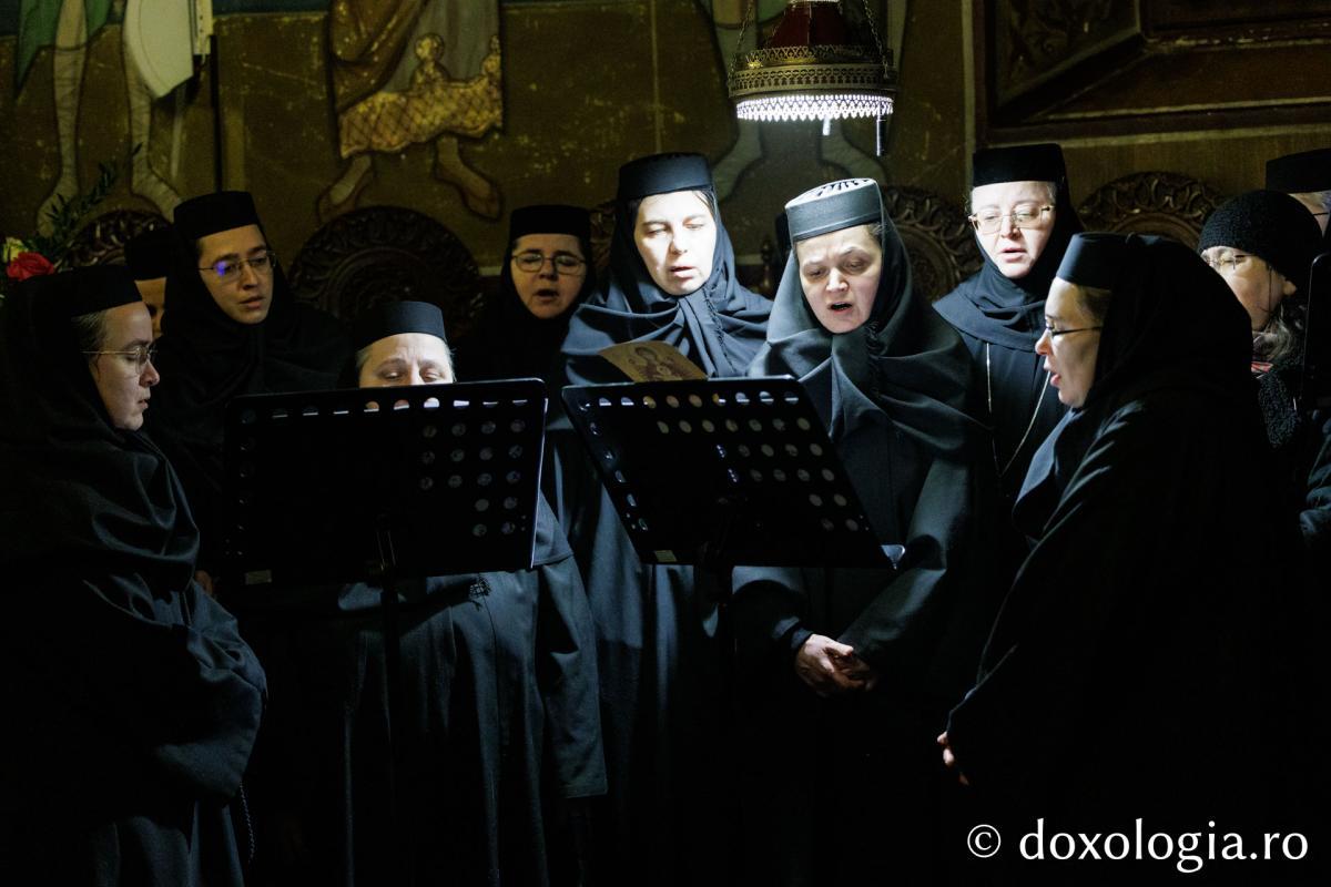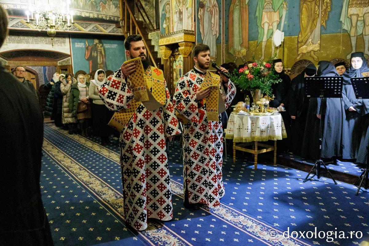 La slujba privegherii a slujit un sobor de preoți și diaconi sub protia părintelui arhimandrit Elisei Nedescu, starețul Mănăstirii „Sfinții Trei Ierarhi” din Iași, iar răspunsurile liturgice au fost date de Corul preoțesc „Apostolii” (în strana dreaptă) și, respectiv, de corul mănăstirii Copou (în strana stângă).